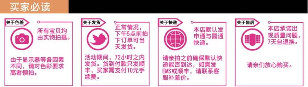 3. 顾客需选择快递方式将商品寄回,并支付快递费用,本商品退货不接受平邮或以到付形式寄回包裹。