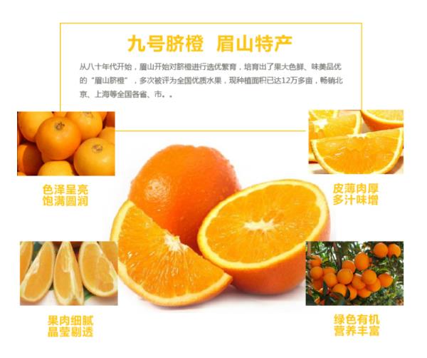 九号脐橙品质优良、无籽多汁、色泽鲜艳,是脐橙中的优等品,是眉山十分著名的特产。九号脐橙果汁中含可溶性固型物11-15%,每100毫升果汁中含糖11.0-13.0克,含柠檬酸0.80-0.95克,维生素C55-75毫克。此外还含有丰富的维生素、防癌物质等。(生鲜水果偏远地区不发货:内蒙古/海南/辽宁/吉林/黑龙江/新疆/甘肃/宁夏/青海/西藏/香港/澳门/台湾)