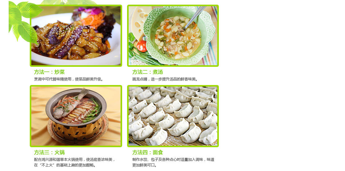 品名:生态鸡精 鸿兴源严格挑选核心养殖区生态土鸡,利用现代高新技术萃取生态土鸡肉中每一滴鲜味精华,保证安全健康的同时,留住每一粒鸡精的自然鲜香,堪比御膳之美。 △鸿兴源鸡精三大特色: 1、 精选原生土鸡:无污染人工养殖土鸡的风味基料,来自原生态饲养环境,天然本质,零激素; 2、坚持品质为本:严格控制基料来源,保证每一粒鸡精的纯度,最大限度还原新鲜鸡肉特有的鲜香,使您的佳肴更加美味; 3、严控工艺流程:采用先进现代化科学生产设备,严格控制工艺流程,不添加任何防腐剂和人工色素;