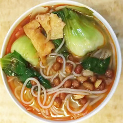步骤二:取约400g的水烧开,加入螺蛳汤料包盒煮好的粉,煮约1分钟后,根据个人口味加入准备好的各种配料配菜,煮沸拌匀即可食用。