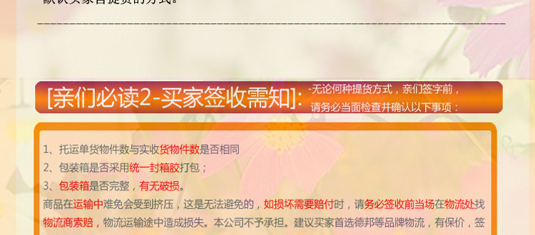 温馨提示:物流需要自提,由于物流到达位置不确定性,物流能到达您所在的市,不一定到达您所在的区或者县城,如您指定到达区或者县城,我们不发货,如未指定到达区域,我司将默认发物流,到达地区由物流到时通知。如有异义,请联系客服,如未声明,我司将默认您同意此项。