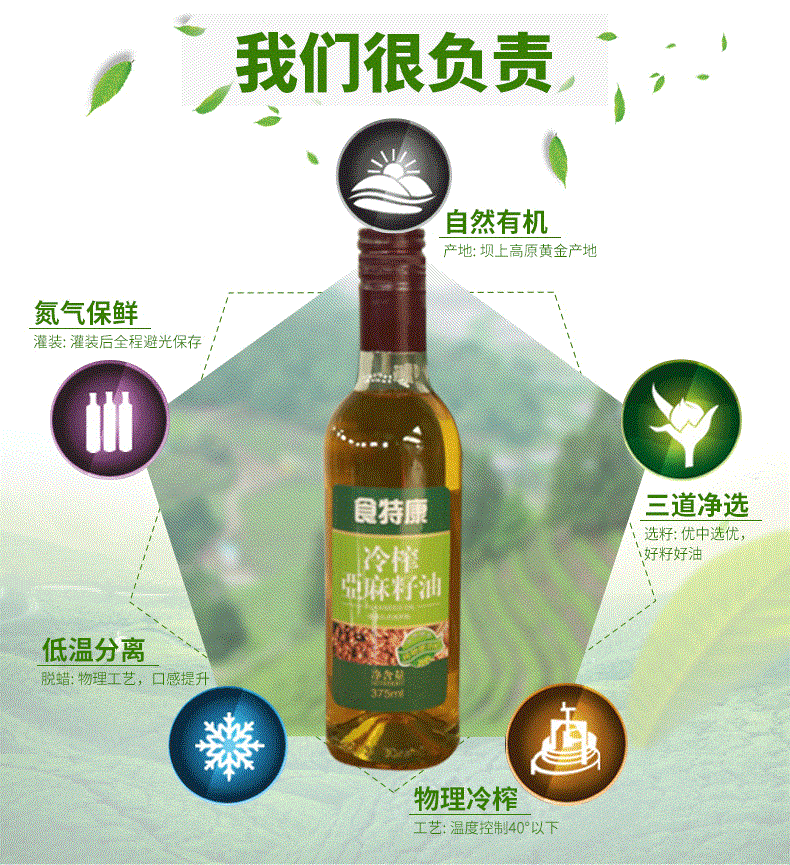 品名:亚麻籽油 原材料产地:中国内蒙古 配料:亚麻籽(非转基因) 净含量:375ml 生产许可号:QS130702010113 执行标准:GB/T8235-2008