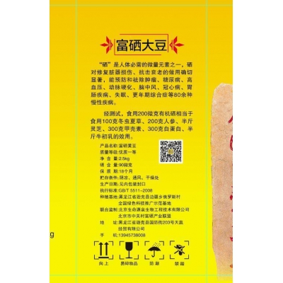 本公司种植基地处于逊克县边疆乡俄罗斯村,种植面积500亩,采用非转基因良种,生物有机肥和富硒营养液种植而成,经国家权威部门检测,完全符合国家富硒标准及要求,本品质量上乘.人工手选.无杂质,产品等级一等,可加工豆浆.豆芽.豆腐等其他豆制品,是自食和馈赠亲友的理想佳品.上述产品保证质量,保证原产地发货。如收货人收到的货与上述质量不符,保证包退包换。