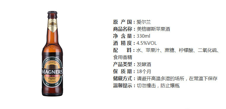 商品名称:整箱 爱尔兰进口啤酒 美格娜斯苹果啤酒 330ml *24瓶 爱尔兰果酒
