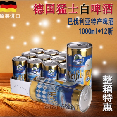 商品名称:德国原装进口洋酒 纯麦啤酒巴伐利亚猛士白啤酒 1L*12听 夏季热销