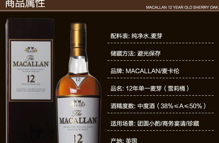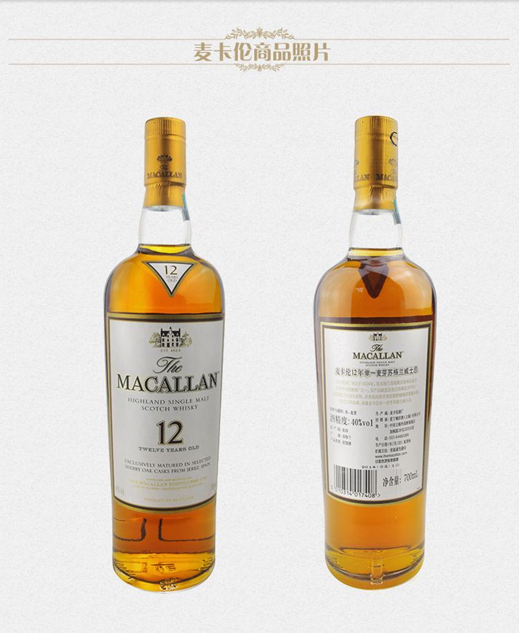 商品名称:英国原装进口MACALLAN麦卡伦12年单一麦芽威士忌700ml 40度烈酒