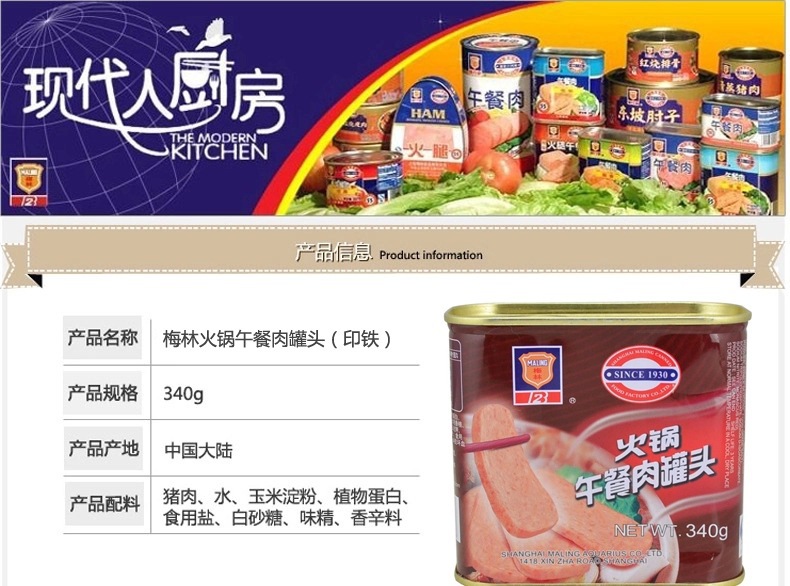 商品名称:上海梅林午餐肉罐头 火锅午餐肉340g 户外罐头食品火锅三明治自热