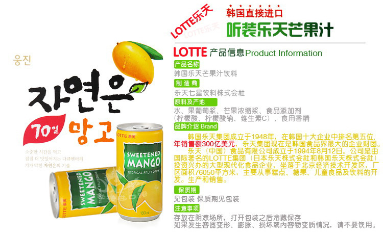 商品名称:乐天芒果汁180ml 正品韩国进口饮料 罐装 15罐/箱