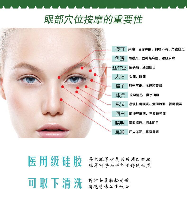 佩戴方法:摘下眼镜���隐形眼镜;对准眼部位置,并调节松紧带的松紧程度, 使护眼仪紧贴双眼,向左右调节导电硅胶间距以适合眼睛距离。