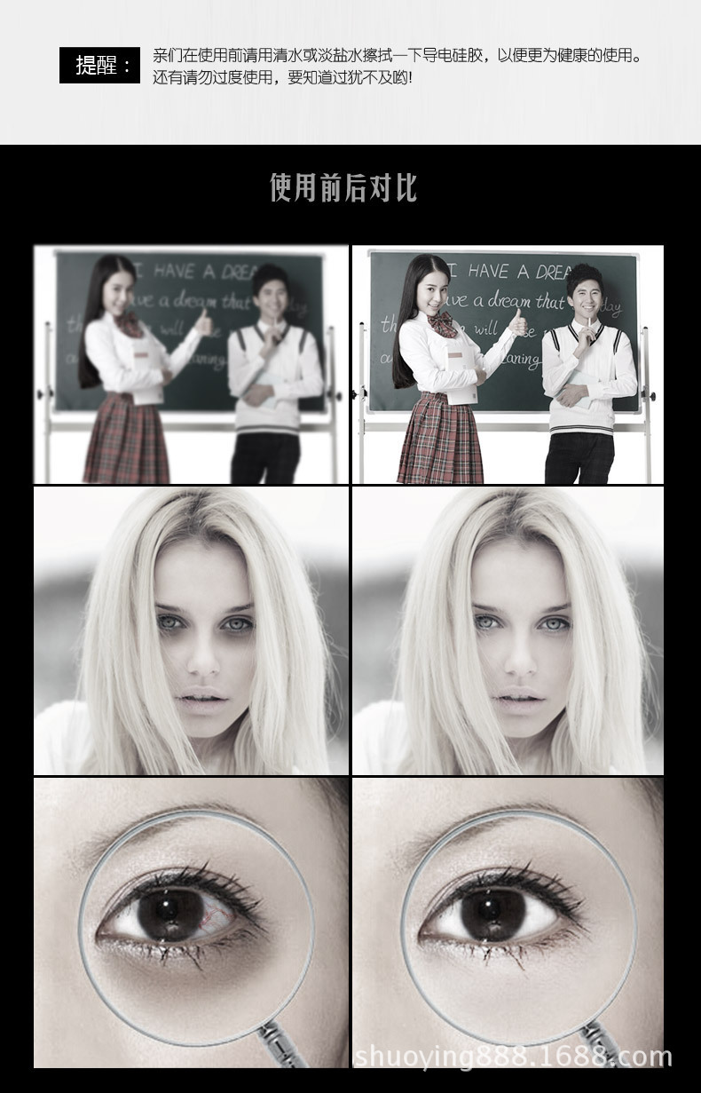 注意:在使用前用清水或淡盐水擦湿导电胶圈;请勿过度使用,以免因眼睛疲劳造成损害。