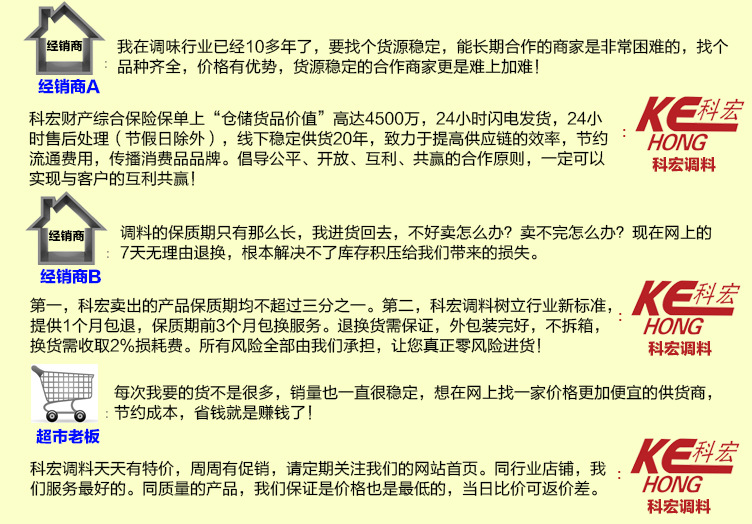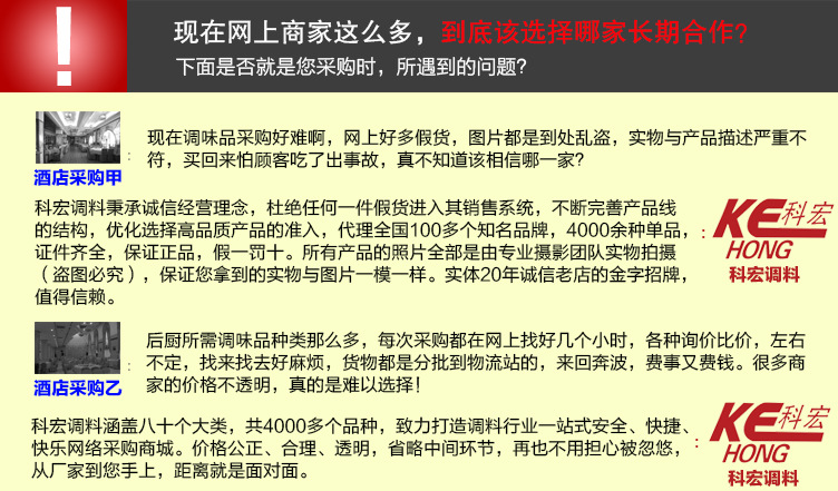 1、科宏调味品商城专注调料行业13年,目前专业代理80个类目,100多个知名品牌,4千余款单品,产品类目涵盖整个调味品行业,为广大客户提供一站式采购服务。网站上没有您需要的产品,请打电话咨询,我们仓库一定有!