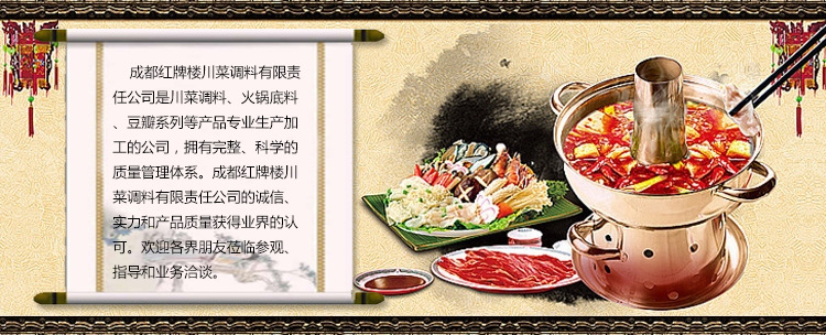 成都红牌楼川菜调料坐落于著名的古蜀文明发祥地郫县,是川菜之魂郫县豆瓣的��祥地。公司成立于08年,是一家专业生产加工川菜调料、火锅底料、豆瓣系列等,公司自成立起,立足于特色餐饮行业,秉承优质的品质和一流的服务的理念,从选择原材料开始就严格把关,供应商全部具备国家QS标准,原料绿色健康,生产环节全部执行国家卫生标准,产品经实验室反复检验,检验合格后由公司统一配送到各 加盟店,规范了各店的质量和口味,真正实现了工业化生产,形成统一的底料生产和物流配送体系。