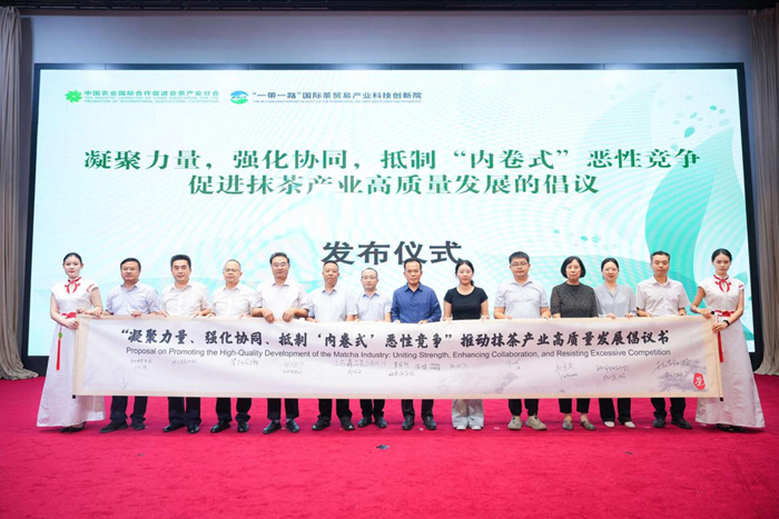 研讨会开始,中国农业国际合作促进会茶产业分会与铜仁市农业农村局、江苏省茶叶协会、安徽省茶业协会、广西茶业协会、广东省茶叶收藏与鉴赏协会、贵州贵茶(集团)有限公司、江苏鑫品茶业有限公司、浙江茗皇天然食品开发股份有限公司、恩施州硒茶供应链有限责任公司、安顺御茶村茶业有限公司、四川早白尖茶业有限公司等十一家单位联合发布了“凝聚力量,强化协同,抵制‘内卷式’恶性竞争,促进抹茶产业高质量发展的倡议”。呼吁全行业坚守质量安全底线、加强技术创新合作、共同开拓国内外市场,推动形成“标准引领、品牌赋能、互利共赢”的发展新格局。