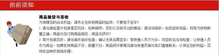 3.关于物流上的损坏我方不会承担任何责任,请买家们在发货前想好货物的包装是否需要打上木架或其它的包装方法!